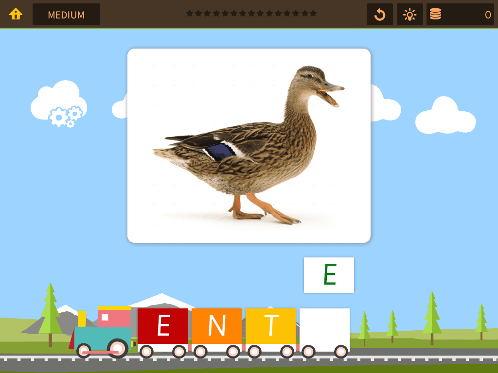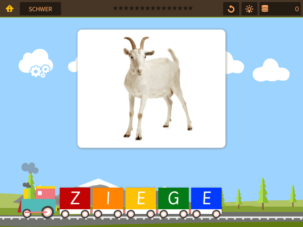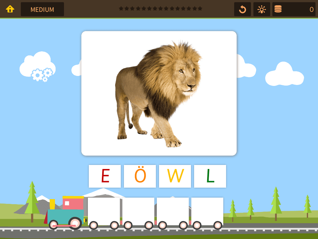 Für jeden korrekten Wortversuch erhält das Kind einen Stern als Zeichen seiner Leistung. Zusätzlich gibt es zu den Sternen entsprechende Belohnungen in Form von Münzen: „einfach“ gibt +3 Münzen, „mittel“ +4 Münzen und so weiter. Das Sammeln von Sternen und Münzen motiviert Kinder und ermutigt sie, stets nach Richtigkeit und Exzellenz zu streben.