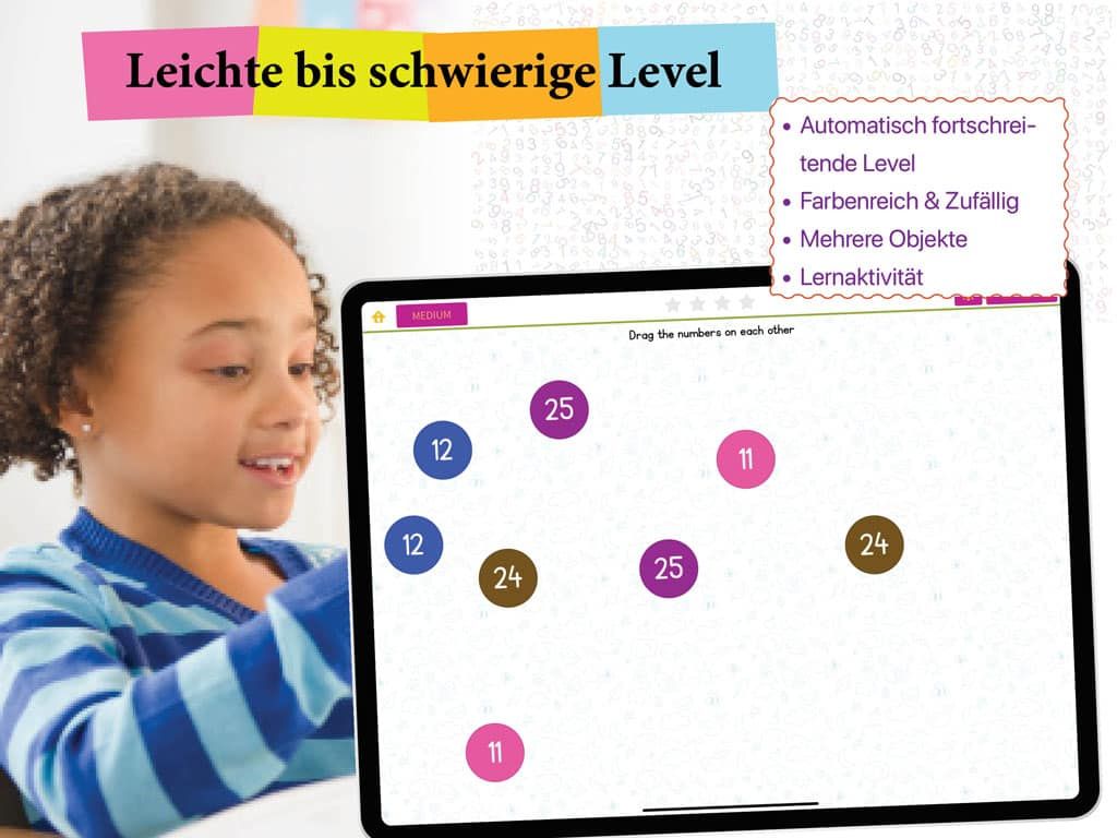 Bei dieser Übung werden Zahlen paarweise präsentiert, die die Kinder ziehen und zuordnen müssen. Beginnend mit einzelnen Zahlen steigert sich der Schwierigkeitsgrad schrittweise und umfasst auch zwei- und dreistellige Zahlen. Mit den fortschreitenden Levels verfeinern die Kinder ihre Zuordnungsfähigkeiten und erleben so ein umfassendes Lernerlebnis.